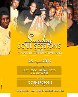 Sunday Soul Sessions with DEMA Entertainment live band held @ CORNER STONE Pub and Grill. Free entrance and gates open at 17h00 TILL LATE.
